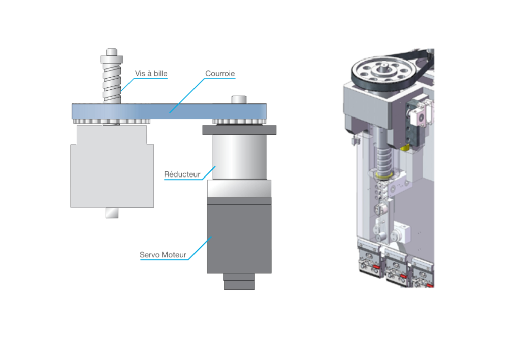 Le coulisseau est déplacé par un dispositif composé par d’un servo moteur et d’un mécanisme d’entraînement à vis à billes. Elle maximise la productivité avec un vérin à grande vitesse et une répétabilité de haute précision (0,001 mm). Cette méthode d’entraînement est supérieure à toutes les autres performances électriques/hydrauliques et son fonctionnement est silencieux.